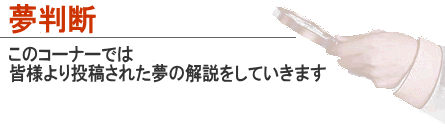 夢判断は、本当に良く当たります。 ここでは、皆さんが夢を見て、その後何が起こったかを投稿していただき、それに西谷が夢判断の解説をするというコンセプトで綴る新コーナー。 どんな夢でも結構です。みんなで、夢判断の検証を楽しもうではありませんか! 尚、このコーナーの内容を中心に、さらに詳しくまとめた大好評の本『暮らしに活かす夢判断』(西谷泰人著/創文刊)もご一読下さい。