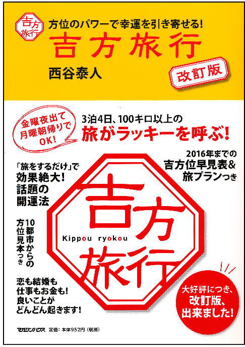 西谷泰人の待望の新刊 『今日のあなたの吉方位』(マガジンハウス 刊 定価952円+税)8月23日(木)、全国書店で一斉発売! 方位学の日盤をフルに活用して、次々と幸運を手に入れよう! という取って置きの秘伝を、余すことなく この一冊に全て集約、 公開しました。 本書が、数え切れない幸運を、 読者の皆様にお届けすることを約束します。 ――365日使える 奇跡の方位術!―― ![]() <画像をクリックすると拡大します> ーーーーーーーーーーーーーーーーーーーーーーーーーーーーーー ★方位に関する便利なサイト ≪吉方位 早楽・地図上 検索システム≫公開! http://www.nishitani-newyork.com/kippoui/ (月額525円。生年月日と住所を入力するだけで、毎日の吉方位が分かり、さらに月盤・年盤でみる開運旅行や引っ越しの吉方位が簡単に分かります。 それもグーグルの地図上に吉方・凶方が色分けされて、一目で分かる便利なサイトです) TOPページ お知らせ! タロット占いが、毎日、 電話で受けられるようになりました 開運パビリオンの鑑定師が、 電話でタロット占いの鑑定をいたします いままで「タロット占い」は、東京・代々木にある開運パビリオンに、直接お越しくださって行う鑑定のみでしたが、明日の12月3日(火)より、お電話でのタロット占いも行います。 電話でも、お会いしている時と、まったく変わらない鑑定が出来ます。 開運パビリオン(東京・代々木)までいらっしゃれない地域にお住いの方も、電話一本で申し込めます。 鑑定師は、お客様の側に立ち、カードが教えるアドバイスを、分かり易くお伝えいたします。 年末年始、お盆を除き、毎日13時〜21時の間に、タロット占いを受けることができます。 タロット占いでは、こんなことが占えます。 目前の、ベストの選択・判断に・・・ ・ 相手は私のことをどう思っているか? 〈恋人・上司・取引先・ペット、などなど〉 ・ この人と結婚するときの注意点 ・ 今、やろうとしている事の展望、問題点、注意点。 ・ AとBの、どちらにしようか? (するか、しないか・・・結婚、離婚、転職、購入など) (するにしても、AとBのどちらにするか、など) ・ 明日の打ち合わせは、どうなるだろう? ・ 今日のこと、明日のこと、ここ半年の運勢は? ※ 悪いカードが出ても、対処をし、心がけを変えて、 良い結果を迎えることができるように、アドバイスいたします。 〜〜〜〜〜〜〜〜〜〜〜〜〜〜〜〜〜〜〜〜〜〜〜〜〜〜 電話でのタロット占いの申込方法、料金など 申し込み方法 : 電話で受け付けます。 申し込んで、すぐに受けることもできます。 (予約が埋まっていなければ) 電話番号 : 080−6551−4126 (オー晴れ、むここい よいフロ) 開運パビリオン受付電話番号 受付時間 : 10時〜21時 (毎日。お盆、年末年始はお休み) (今年は12月30日から、1月5日までお休み) 鑑定を受けられる時間帯 : 毎日13時〜21時 (申し込み時点で、ご都合の良い鑑定日時を伺います) 鑑定師 : 開運パビリオンの鑑定師 (曜日や時間帯により、鑑定師が代わりますので、 下記の予定表をご覧ください) 鑑定時間と料金 : 15分/3千円(税込み、電話代込み)。 鑑定料は原則前払いですが、 すぐにお受けになる場合は、後払い可 (当日含む3日以内) お支払方法 : 銀行振り込み、あるいは郵便局での振替 (振込手数料は、お客様負担でお願いいたします) ★(銀行の場合)横浜銀行 戸塚支店 普通 1814489 口座名義 カ)ソウブン ★(ゆうちょ銀行の場合) 〇二九(ゼロニキュウ)店 当座 0067288 ★(郵便局で払込取扱票を使う場合) 00250-0-67288 加入者名 SOBUN 平成25年12月の鑑定師の予定 12月3日(火)、4日(水)・・・岡本悠加先生 12月5日(木)・・・山口真季 先生 12月6日(金)・・・森田小百合 先生 12月7日(土)・・・中西美華 先生 12月8日(日)・・・泉美伶安 先生〈13〜17時〉 沢村俊佑 先生〈17〜21時〉 12月9日(月)・・・岡本悠加 先生 12月10日(火)・・・岡本悠加 先生<13〜16時半> 佐野春菜&岩佐佳世子 先生<16時半〜21時> 12月11日(水)・・・岡本悠加 先生 12月12日(木)・・・山口真季 先生 12月13日(金)・・・森田小百合 先生 12月14日(土)・・・中西美華先 生 12月15日(日)・・・泉美伶安 先生〈13〜17時〉 沢村俊佑先生〈17〜21時〉 12月16日(月)、17日(火)、18日(水)・・・岡本悠加 先生 12月19日(木)・・・山口真季 先生 12月20日(金)、21日(土)・・・森田小百合 先生 12月22日(日)・・・泉美伶安 先生 12月23日(月)・・・中西美華 先生 12月24日(火)・・・岡本悠加 先生<13〜17時> 森田小百合 先生<17〜21時> 12月25日(水)・・・岡本悠加 先生 12月26日(木)・・・山口真季 先生 12月27日(金)・・・森田小百合 先生 12月28日(土)・・・中西美華 先生 12月29日(日)・・・泉美伶安 先生 12月30日から1月5日(日)まで、お休み 〜〜〜〜〜〜〜〜〜〜〜〜〜〜〜〜〜〜〜〜〜〜〜〜〜 次に、開運パビリオンのタロット占いを受けた方の感想を、2つご紹介いたします。 タロット占いの体験談.1 “今は止めた方がいいですよ” の答えに、目が覚める S.A.41歳 男性 私は、不動産物件の購入に関して、買うべきか