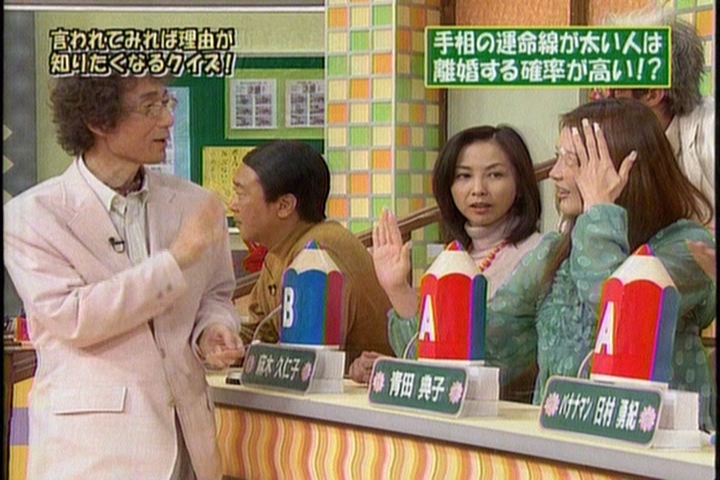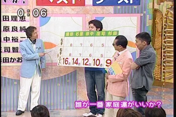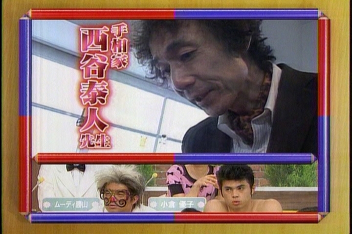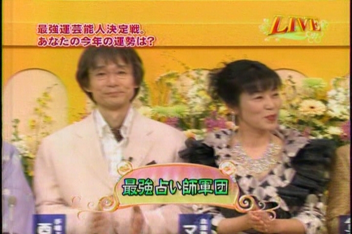 なお「笑っていいとも!増刊号」という日曜日朝10時〜11時45分の番組もあります。この番組は、その週の『笑っていいとも!』を編集して放送するものなので、日曜日に西谷泰人が出ているコーナーを見たという方もたくさんいらっしゃいました。 ということは、もしかすると毎週2回、出ることになるかもしれません。水曜日は見れないという方のために、ご紹介しておきます。 7/17(日)朝10時〜の、「笑っていとも!増刊号」(今回は生放送)は西谷泰人が生出演! ナント、会場のお客様100人全員の手相を観る、という恐ろしい企画になっています。ひええ〜っ。 手相コーナーの突っ込み役が、あの青木さやかさんというんですから、激しく盛り上がりそうです(笑)。 番組内では時折、その手相鑑定のシーンが放映されるんですが、どうなることやら〜。 西谷泰人 2004年元旦 フジテレビ「最強運芸能人決定戦」に出演!