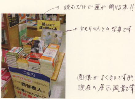 ★紀伊國屋書店・加古川店の浅沼店長、「西谷泰人フェア!」有難うございます 時々、兵庫県からいらっしゃる鑑定のお客様に、どちらからいらっしゃいましたか? とお聞きすると、加古川です、とお答えになる方が多いのですが、その理由は! 紀伊國屋書店・加古川店の浅沼店長が、ナント『西谷泰人フェア』を、店内で一年中やって下さっていたからでした!! 写真は、昨日創文に届いた、浅沼店長からのお便りに入っていたものです。 ![]() 紀伊國屋書店・加古川店 西谷泰人フェア風景 (手書き文字は、浅沼店長直筆) 浅沼店長は、とっても優しくて、仕事熱心。中央大学卒で易学などに精通した、36歳の独身です〜! 是非お近くの方は、会いに行ってみてください。 店長は、自分で気に入った本には命を賭けて宣伝する、というモットーで、これまでにも、大分、私の本を売って下さったんですよ〜! 西谷本の守護神、浅沼店長、いつも有難うございます!! |