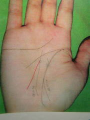 本命の恋人が近々決定!? 近々結婚? を予告する運命線に合流する影響線(赤線)が見られます。