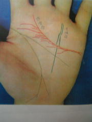 感情線の乱れている人は、感情表現が豊かで、情感の乗せ方が抜群にうまい人。彼女にとって女優は天職です。(赤い線) 長い太陽線が、成功と名声を得ることを約束している。